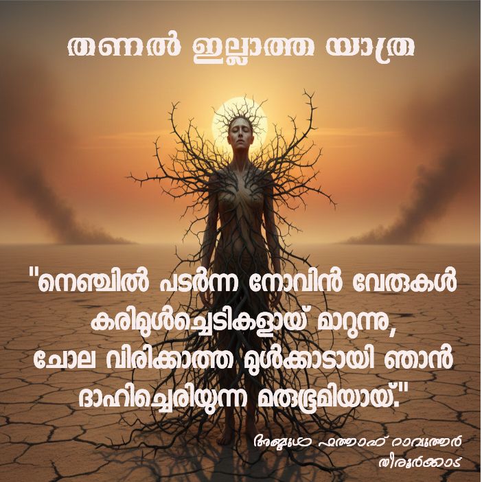രചന : ഉണ്ണി അഷ്ടമിച്ചിറ ✍ നാട്ടുകൂട്ടം പിഴയാണെന്ന് വിധിയെഴുതി. അത് അംഗീകരിക്കാനോ പിഴയടയ്ക്കാനോ തയ്യാറാകാത്ത അവളെ ആരോരുമറിയാതെ ആരോ ചിലർ തട്ടിയെടുത്ത് നാടുകടത്തി. കാട്ടിലേക്കാണ് കടത്തിയത്. അവിടേക്കുണ്ടായിരുന്നതൊരു ഒറ്റയടിപ്പാതയായിരുന്നു. തിരിച്ചറിയാനാകാത്തവിധം അത് പുല്ലുമൂടി കിടന്നിരുന്നു. കാനന മദ്ധ്യത്തിൽ, പച്ച പുതച്ച…