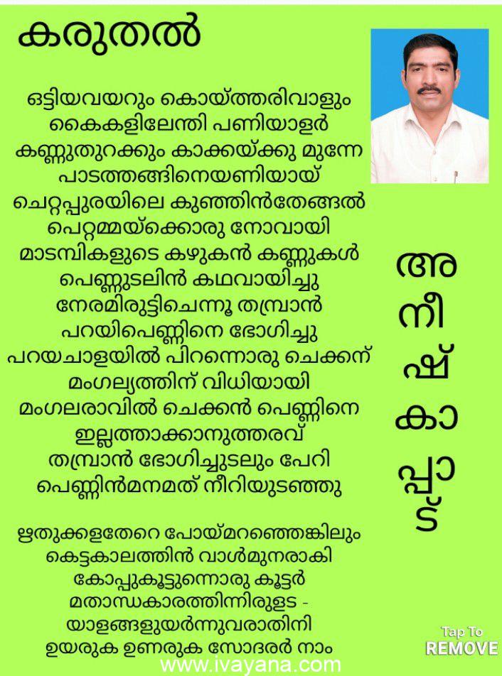 ക്രൂരമായ ഈ ലോകത്തെക്ക് സഹോദരീ നീ തിരിഞ്ഞുനോക്കരുത്. നിന്റെ കഷ്ടപ്പാടുകള് അവസാനിച്ചു, നിന്റെ ആത്മാവ് ഇപ്പോള് സ്വതന്ത്രയാണ്’. എന്റെ വർഗ്ഗത്തിൽ പെട്ട മനുഷ്യർ ഗർഭിണിയായ ഒരു പൂച്ചയെ കഴുത്തിൽ കുരുക്കിട്ട് തൂക്കി കൊല്ലുന്ന ക്രൂരന്മാരാണ്. വിശപ്പു മാറ്റാൻ അന്നം മോഷ്ടിച്ച മധു എന്ന മനോനില തെറ്റിയ ആദിവാസി യുവാവിനെ കൂട്ടം ചേർന്നു തല്ലി കൊല്ലുന്നവരാണ്. സ്വന്തം ഭാര്യയെ കരിമൂർഖനെ കൊണ്ടുവന്നു കടിപ്പിച്ചു കൊല്ലുന്ന സമാനതകൾ ഇല്ലാത്ത ക്രൂരരാണ്. കാമവെറി തീർക്കാൻ സ്വന്തം കുഞ്ഞിനെ പോലും കടൽഭിത്തിയിൽ തലയടിച്ചു കൊല്ലുന്നവരാണ്. കാമുകനുമൊത്ത് ജീവിക്കാൻ ആ കാമുകനെയും കൂട്ടി സ്വന്തം അമ്മയേയും ഭർത്താവിനെയും ക്രൂരമായി വെട്ടിതുണ്ടമാക്കാൻ മനസ്സുള്ളവരാണ്. സാത്താൻ സേവക്ക് തടസ്സം നിന്ന മാതാപിതാക്കളെയും കുടുംബാംഗങ്ങളെയും കൊലപ്പെടുത്തുന്നവരാണ് ഞങ്ങൾ. സ്വത്തിനു വേണ്ടി ഒരു കുടുംബത്തെ ഒന്നടങ്കം കൊന്നൊടുക്കിയ സയനേഡ് ചേടത്തിമാർ അടങ്ങുന്നതാണ് മനുഷ്യർ. പ്ലസ്ടുവിൽ പഠിക്കുന്ന സഹപാഠിയെ നിസ്സാര കാര്യത്തിന് തലക്കടിച്ചു കൊന്നു കുഴിച്ചു മൂടാൻ മടിയില്ലാത്തവരാണ്. മദ്യലഹരിയിൽ സ്വന്തം അച്ഛനെയും അമ്മയെയും വരെ കൊലപ്പെടുത്തിയ മലയാളികളാണ് ഞങ്ങൾ. അങ്ങനെയുള്ള മനുഷ്യർ തന്നെയാണ് ഗർഭിണിയായ നിനക്ക് കൈതച്ചക്കയിൽ പടക്കം പൊതിഞ്ഞു നൽകി നിന്നെ ക്രൂരമായി കൊന്നത്.