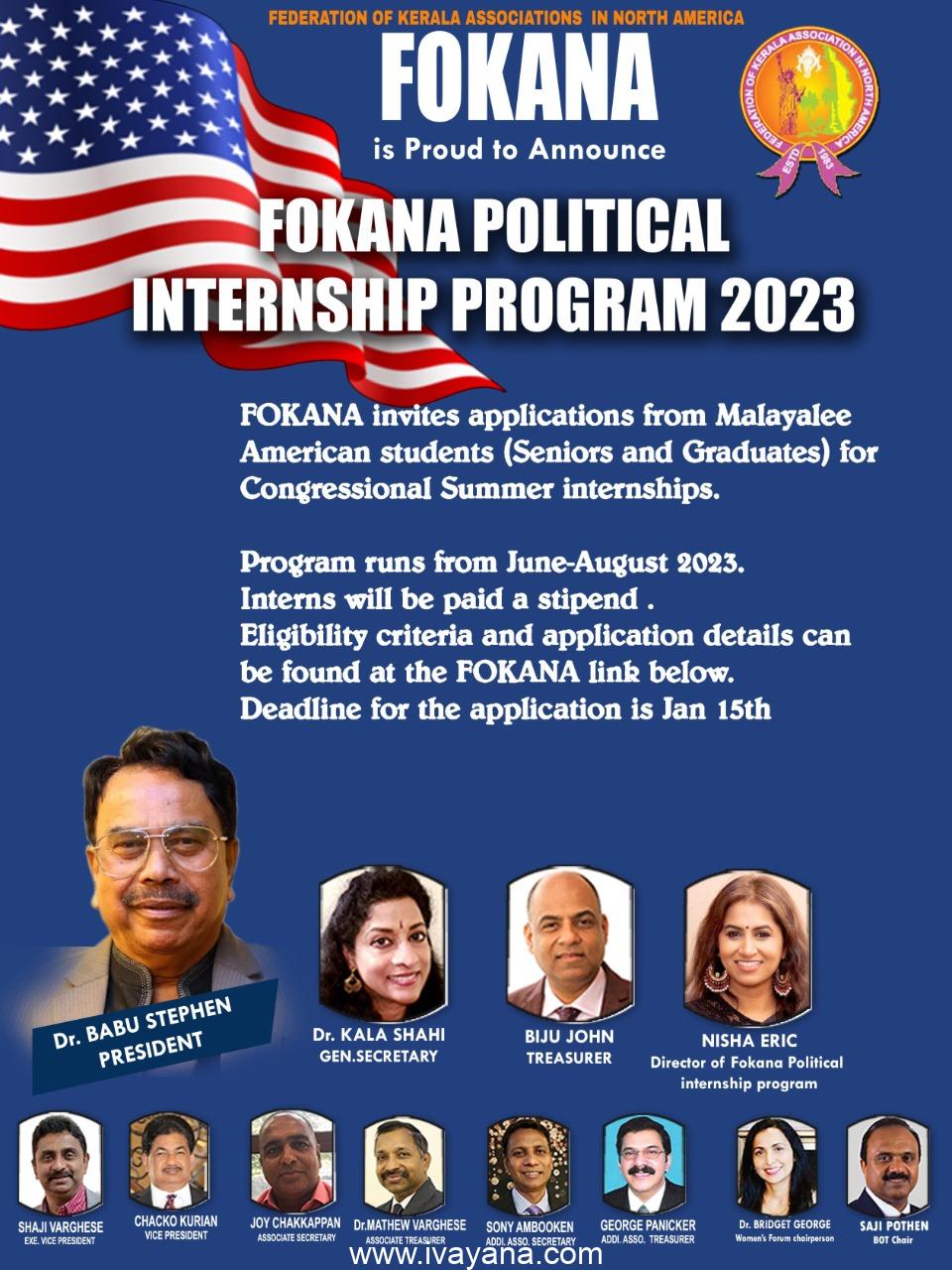 ന്യൂ യോർക്ക് : അമേരിക്കയിലുള്ള മലയാളീ യുവാക്കളെ മുഖ്യധാരാ രാഷ്ട്രീയത്തിലേക്ക് കൈപിടിച്ച് ഉയർത്തുന്നതിന് വേണ്ടി ഫൊക്കാന വൈറ്റ് ഹൗസ് ഇന്റേൺഷിപ്പ് ഏർപ്പെടുത്തുന്നു. അമേരിക്കയിൽ സ്ഥിരതാമസം ആക്കിയിട്ടുള്ള മലയാളീ കുട്ടികൾക്ക് വേണ്ടിയാണ് ഈ ഇന്റേൺഷിപ്പ് ഒരുക്കിയിരിക്കുന്നത്. $ 5000.00 സ്റ്റെയ്ഫെണ്ടോട് ക്കൂടി രണ്ടിൽ കൂടുതൽ കുട്ടികൾക്ക് (നാലു വരെ )നൽകുവാൻ ആണ് തീരുമാനിച്ചിരിക്കുന്നതെന്ന് പ്രസിഡന്റ് ഡോ.ബാബു സ്റ്റീഫൻ അറിയിച്ചു.