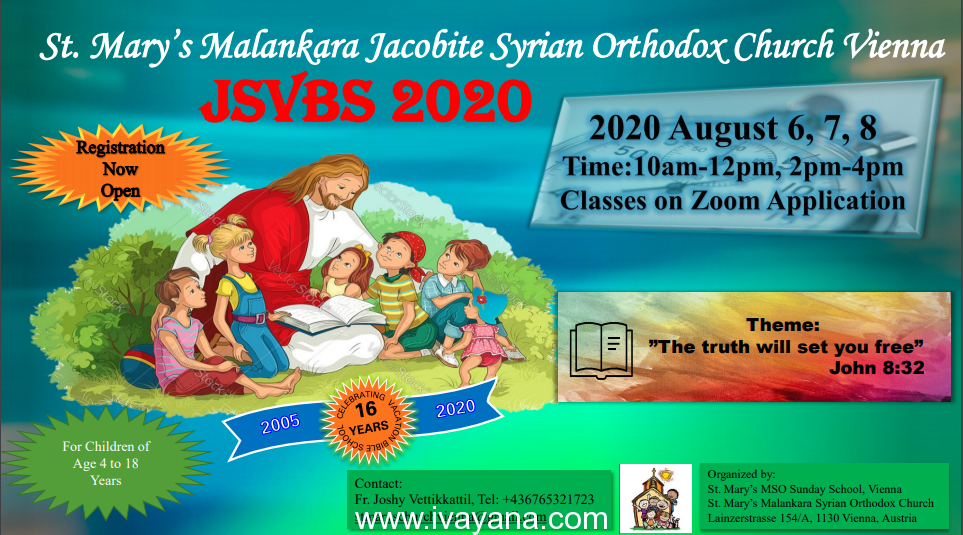 വിയന്ന സെന്റ് മേരീസ് മലങ്കര സിറിയൻ ഓർത്തഡോക്സ് ദൈവാലയത്തിൽ എല്ലാവർഷവും നടത്തിവരുന്ന വെക്കേഷൻ ബൈബിൾ സ്കൂൾ(VBS) ഈ വർഷവും സെന്റ് മേരീസ് സണ്ടെസ്കൂളിന്റെ നേതൃത്വത്തിൽ 2020 ആഗസ്റ്റ് 6, 7, 8 തിയതികളിലായി 4 മുതൽ 17 വരെ പ്രായമുള്ള കുട്ടികൾക്കായി ഓൺലൈനായി നടത്തുന്നതിനുള്ള ക്രമീകരണങ്ങൾ ചെയ്തുവരുന്നു. ദൈവവചനങ്ങളിൽ കുട്ടികൾക്ക് കൂടുതൽ താൽപര്യം ജനിപ്പിക്കുകയും അവരുടെ ദൈനംദിന ജീവിതത്തിൽ ക്രിസ്തീയ വിശ്വാസം മുറുകെ പിടിക്കുവാൻ അവരെ പ്രാപ്തരാക്കുവാൻ ഉപകരിക്കുന്ന ഉപദേശങ്ങൾ ചിത്രരചനയിലൂടെയും കഥകളിലൂടെയും ക്ലാസ്സുകളിലൂടെയും ആക്ഷൻസോങ്ങുകളിലൂടെയും മറ്റും നൽകുക എന്നതാണു ഈ ഉദ്യമത്തിന്റെ ലഷ്യം.