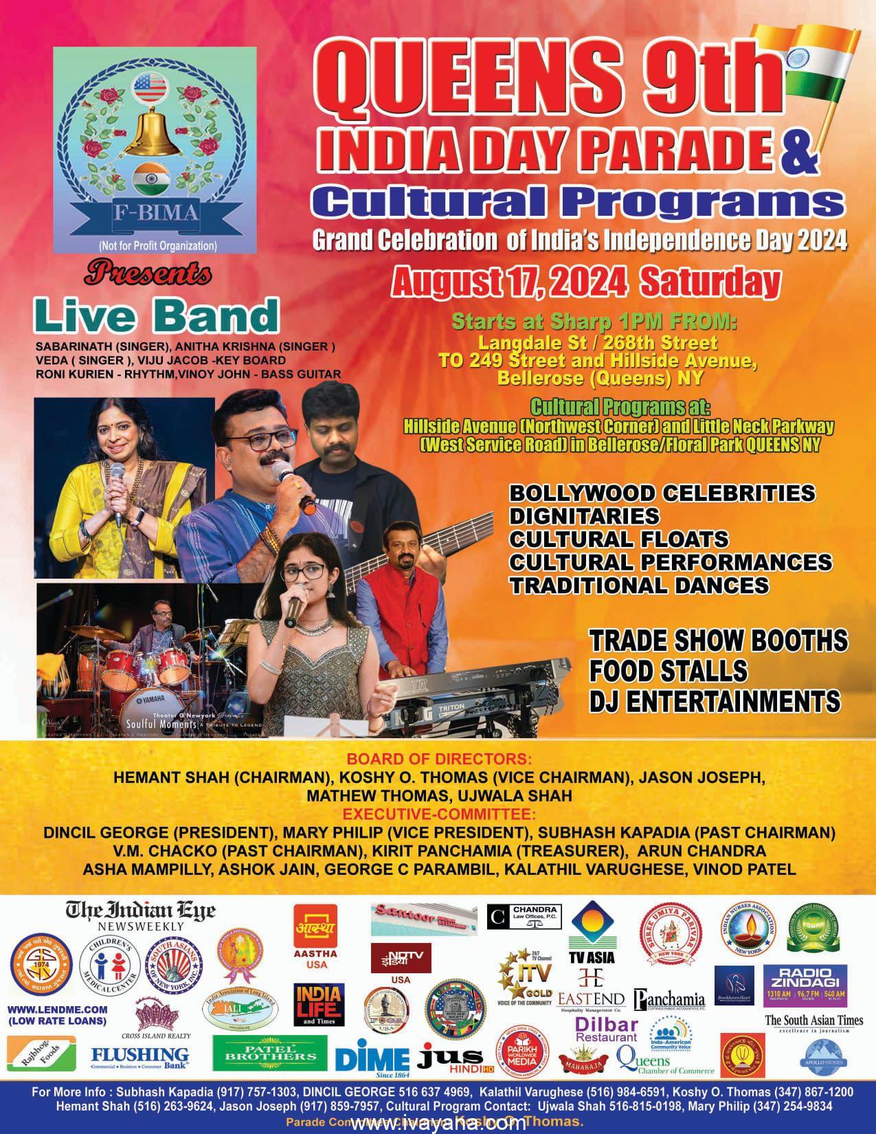 ന്യൂയോർക്ക്: ഫ്ലോറൽപാർക്ക്-ബല്ലെറോസ് ഇന്ത്യൻ മെർച്ചൻറ്സ് അസ്സോസ്സിയേഷൻ (F-BIMA) കഴിഞ്ഞ എട്ട് വർഷമായി ഇന്ത്യൻ സ്വാതന്ത്ര്യ ദിനത്തോടനുബന്ധിച്ച് നടത്തിവരുന്ന ഇന്ത്യാ ഡേ പരേഡിന്റെ ഒമ്പതാമത് പരേഡ് ഈ മാസം 17 ശനിയാഴ്ച ഉച്ചക്ക് 1 മണി മുതൽ നടത്തപ്പെടുന്നു. ഫ്ലോറൽപാർക്കിലെ ഹിൽസൈഡ് അവന്യൂ റോഡിൽ ലാങ്ഡെയിൽ സ്ട്രീറ്റ് (268th Street) മുതൽ 249 സ്ട്രീറ്റ് വരെയാണ് പരേഡ് നടത്തപ്പെടുന്നത്. ഒമ്പതാമത് ഇന്ത്യ ഡേ പരേഡിനുള്ള ഒരുക്കങ്ങളെല്ലാം പൂർത്തി ആയതായി പരേഡ് കമ്മറ്റി ചെയർമാൻ ഹേമന്ത് ഷാ, വൈസ് ചെയർമാൻ കോശി തോമസ്, F-BIMA പ്രസിഡൻറ് ഡിൻസിൽ ജോർജ്, വൈസ് പ്രസിഡൻറ് മേരി ഫിലിപ്പ് എന്നിവർ സംയുക്തമായി പ്രസ്താവിച്ചു.