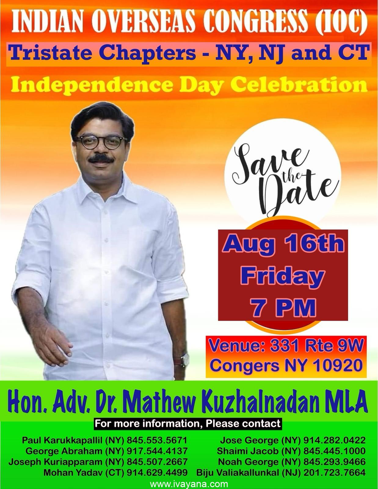 ട്രൈസ്റ്റേറ് ഇന്ത്യൻ നാഷണൽ കോൺഗ്രസിൻറെ ആഭിമുഖ്യത്തിൽ ഇന്ത്യയുടെ 78-ആം സ്വാതന്ത്ര്യ ദിനാഘോഷവും നടത്തപ്പെടുന്ന സമ്മേളനത്തിൽ മുഖ്യ അതിഥിയായാണ് അദ്ദേഹം എത്തുന്നത്. ഐ.ഓ.സി ചുമതലക്കാരായ പോൾ കറുകപ്പള്ളിൽ, ജോർജ് എബ്രഹാം, ജോസഫ് കുരിയപ്പുറം, ജോസ് ജോർജ് ഷൈമി ജേക്കബ്,നോവാ ജോർജ്, മോഹൻ യാദവ് ബിജു വലിയകല്ലുങ്കൽ എന്നിവരുടെ നേതൃത്വത്തിലാണ് സ്വീകരണ യോഗം ക്രമീകരിച്ചിരിക്കുന്നത്. താല്പര്യമുള്ള എല്ലാ ജനാധിപത്യ വിശ്വാസികളെയും പ്രസ്തുത യോഗത്തിലേക്ക് സംഘാടകർ ക്ഷണിക്കുന്നു.