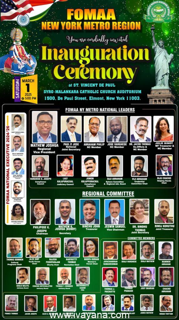 ന്യൂയോർക്ക്: അമേരിക്കൻ മലയാളീ സംഘടനകളുടെ ഏറ്റവും വലിയ അംബ്രല്ലാ സംഘടനയായ ഫോമായുടെ ന്യൂയോർക്ക് മെട്രോ റീജിയൻറെ 2024-2026 ദ്വൈവാർഷിക പ്രവർത്തനകാലത്തിന്റെ പ്രവർത്തനോദ്ഘാടനം മാർച്ച് 1 ശനി വൈകിട്ട് 5 മണിക്ക് എൽമോണ്ടിൽ നടത്തപ്പെടുന്നു. എൽമോണ്ടിലെ സെൻറ് വിൻസെൻറ് ഡീപോൾ മലങ്കര കത്തോലിക്കാ കത്തീഡ്രലിൻറെ ആഡിറ്റോറിയത്തിൽ (St. Vincent DePaul Malankara Catholic Cathedral, 1500 DePaul Street, Elmont, NY 11003) ഫോമാ നാഷണൽ നേതാക്കളുടെയും മറ്റ് വിശിഷ്ട വ്യക്തികളുടെയും മഹനീയ സാന്നിദ്ധ്യത്തിലാണ് പ്രവർത്തനോദ്ഘാടനം നടത്തപ്പെടുന്നത്. ഫോമാ നാഷണൽ നേതാക്കളെ കൂടാതെ ന്യൂയോർക്ക് അസ്സംബ്ലിമാൻ തോമസ് മക്കെവിറ്റ്, ടൌൺ ഓഫ് നോർത്ത് ഹെംപ്സ്റ്റഡ് സൂപ്പർവൈസർ ജെന്നിഫർ ഡിസേന, ന്യൂയോർക്ക് പോലീസ് ഇൻസ്പെക്ടർ ഷിബു മധു എന്നിവർ മുഖ്യാതിഥികളായിരിക്കും.