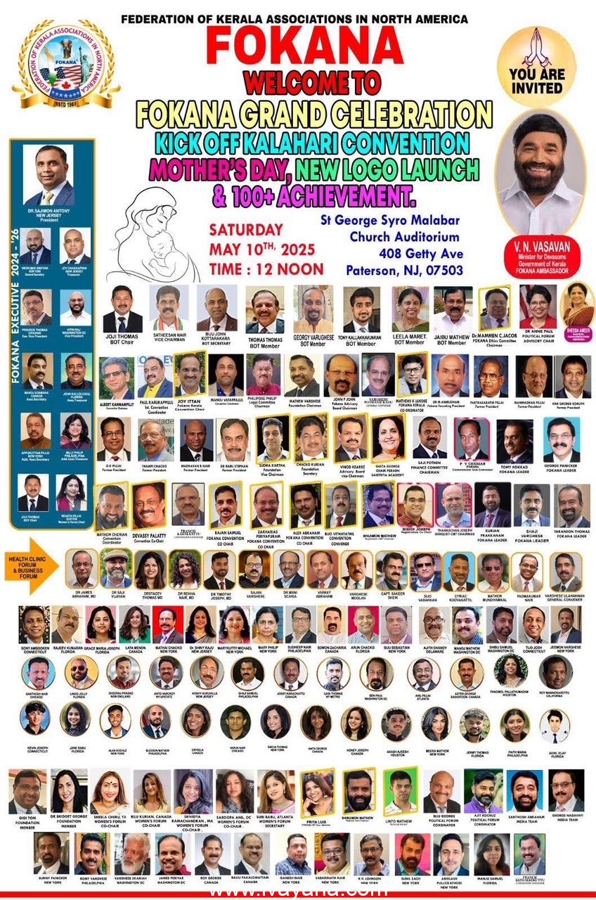 ന്യൂ യോർക്ക് : ഫൊക്കാന കാലഹാരി കൺവെൻഷൻ കിക്കോഫ്, ഫൊക്കാനാ ലോഗോ ലോഞ്ചിങ് , മതേർസ് ഡേ ആഘോഷം എന്നിവ സംയുക്തമായി 2025 മെയ് 10 ശനിയാഴ്ച ഉച്ചക്ക് 12 മണി മുതൽ സെന്റ്. ജോർജ് സിറോ മലബാർ ചർച്ച് ഓഡിറ്റോറിയത്തിൽ ( 408 Getty Avenue, Paterson, NJ 07503) വെച്ച് അതി വിപുലമായ പരിപാടികളോട് നടത്തുന്നതാണ് എന്ന് പ്രസിഡന്റ് സജിമോൻ ആന്റണി അറിയിച്ചു.