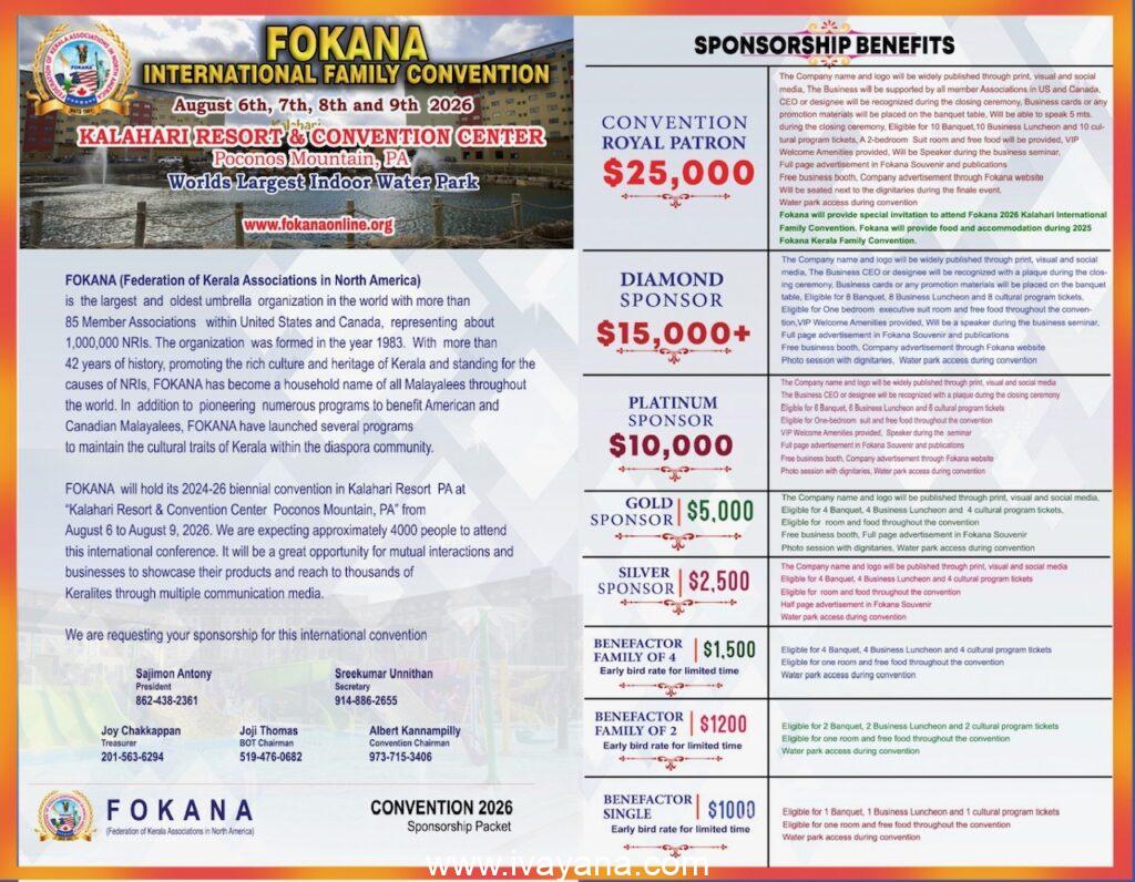 2026 ഓഗസ്റ് 6,7,8,9 തീയതികളിൽ പെൻസിൽവേനിയയിലെ കൽഹാരി റിസോർട്ടു ആണ് ഫൊക്കാനയുടെ കൺവെൻഷന്റെ വേദി. അമേരിക്കയിൽ നിന്നും ലോകത്തിന്റെ വിവിധ ഭാഗങ്ങളിൽ നിന്നും നിരവധി പ്രതിനിധികളും വിശിഷ്ട വ്യക്തികളും ഇതിൽ പങ്കെടുക്കും. ഫൊക്കാനയുടെ ചരിത്രത്തിൽ ഏറ്റവും വലിയ കൺവെൻഷൻ നടത്തുവാൻ ആണ് ഫൊക്കാന കമ്മിറ്റി തയാർ എടുക്കുന്നത്.
