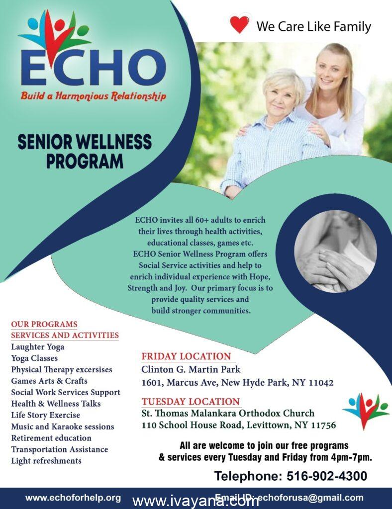 ഈ സാഹചര്യം മനസ്സിലാക്കിയാണ് ന്യൂയോർക്ക് ന്യൂഹൈഡ് പാർക്ക് കേന്ദ്രീകൃതമായി 2013 മുതൽ പ്രവർത്തിക്കുന്ന ECHO (Enhance Community through Harmonious Outreach) എന്ന സന്നദ്ധ സംഘടന മലയാളീ സമൂഹത്തിലെ മുതിർന്നവരെ ചേർത്ത് നിർത്തുന്നതിനും അവർക്ക് വേണ്ടതായ കരുതലും പരിഗണനയും നൽകി ഏകാന്തതയിൽ നിന്നും ഒറ്റപ്പെടലിൽ നിന്നും അവർക്കു മോചനം നൽകുന്നതിനും പ്രവർത്തിക്കുവാൻ തുടങ്ങിയത്. ECHO SENIOR WELLNESS എന്ന പേരിൽ മുതിർന്നവരുടെ ഉന്നമനത്തിനും ആരോഗ്യ പരിപാലനത്തിനും സൗഹൃദ കൂട്ടായ്മക്കും ഊന്നൽ നൽകി എല്ലാ വെള്ളിയാഴ്ചകളിലും ഉച്ചക്ക് ശേഷം നാല് മണിക്കൂറോളം ഒരു കൂട്ടായ സമൂഹമായി ചേർന്ന് തുടങ്ങിയത്. വെള്ളിയാഴ്ചകളിൽ ന്യൂഹൈഡ് പാർക്കിലുള്ള ക്ലിന്റൺ ജി മാർട്ടിൻ (Clinton G Martin Park Community Hall, 1601 Marcus Avenue, New Hyde Park, NY 11042) എന്ന ടൌൺ ഓഫ് നോർത്ത് ഹെംപ്സ്റ്റഡിന്റെ കമ്മ്യൂണിറ്റി ഹാളിലാണ് പരിപാടികൾ സംഘടിപ്പിക്കുന്നത്. ഏകദേശം നാല് വർഷങ്ങൾക്ക് മുമ്പ് ചെറിയ കൂട്ടായ്മയായി ആരംഭിച്ച പ്രസ്തുത പ്രൊജക്റ്റ് ഇന്ന് ലോങ്ങ് ഐലൻഡിലെ മറ്റൊരു സ്ഥലത്തേക്ക് കൂടി വ്യാപിപ്പിച്ചു.