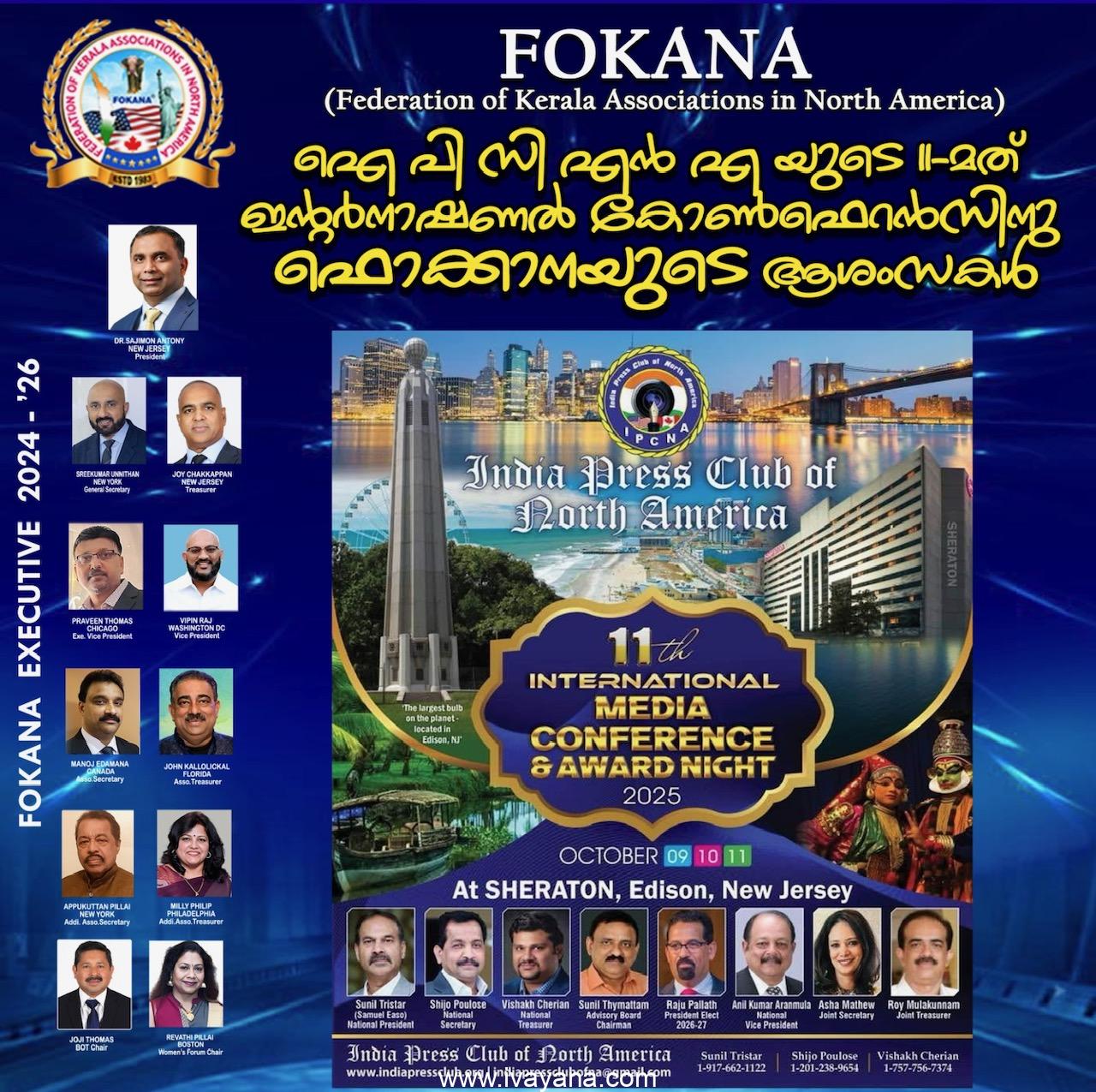 ന്യൂ യോർക്ക്: ഇന്ത്യ പ്രസ് ക്ലബ് ഓഫ് നോർത്ത് അമേരിക്കയുടെ (ഐ പി സി എൻ എ) ദേശിയ കൺവെൻഷൻ ഒക്ടോബർ 9, 10, 11 തീയതികളിൽ ന്യൂ ജേഴ്സിയിലെ എഡിസണിലുള്ള പ്രസിദ്ധമായ ഷെറാട്ടൺ ഹോട്ടലിൽ വെച്ച് നടത്തുബോൾ അത് മാധ്യമ ലോകത്ത് തന്നെ ഒരു നവ്യാനുഭവം സൃഷ്ടിക്കുകയാണ്. ഐ പി സി എൻ എ ദേശിയ കൺവെൻഷന് ഫൊക്കാനയുടെ സ്നേഹ ആശംസകൾ നേരുന്നതായി പ്രസിഡന്റ് സജിമോൻ ആന്റണി അറിയിച്ചു.