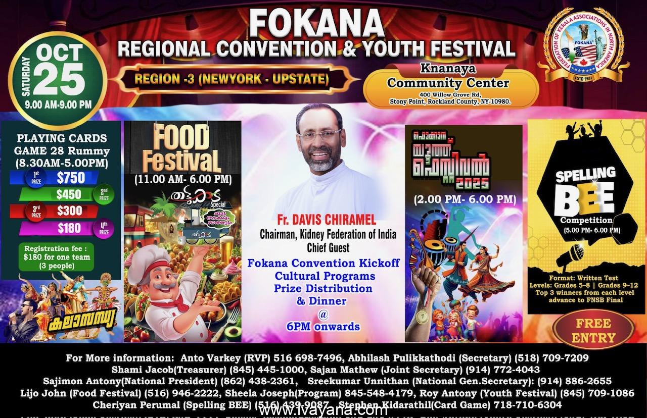 ന്യൂ യോർക്ക് : 2025 ഒക്ടോബർ 25, ശനിയാഴ്ച റോക്കലാൻഡ് കൗണ്ടിയിലെ ക്നാനായ കമ്മ്യൂണിറ്റി സെന്ററിൽ വെച്ച് (400 Willow Grove Road, Stoney Point , Rockland County) നടത്തുന്ന ഫൊക്കാനാ ന്യൂ യോർക്ക് അപ്പ്സ്റ്റേറ്റ് റീജിയണൽ കൺവെൻഷന്റെ ഫ്ലയര് കൊല്ലം എം.പി എൻ.കെ. പ്രേമചന്ദ്രൻ , റാന്നി എം.എൽ.എ. പ്രമോദ് നാരായൺ, മാധ്യമ പ്രവർത്തകരായ ജോണി ലൂക്കോസ് (മലയാള മനോരമ ), ലീൻ ജസ്മാസ് (ചാനൽ 18) , മോത്തി രാജേഷ് (മാത്രുഭൂമി ചാനൽ ) എന്നിവർ ചേർന്ന് നിർവഹിച്ചു.