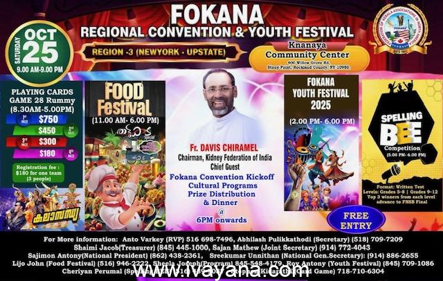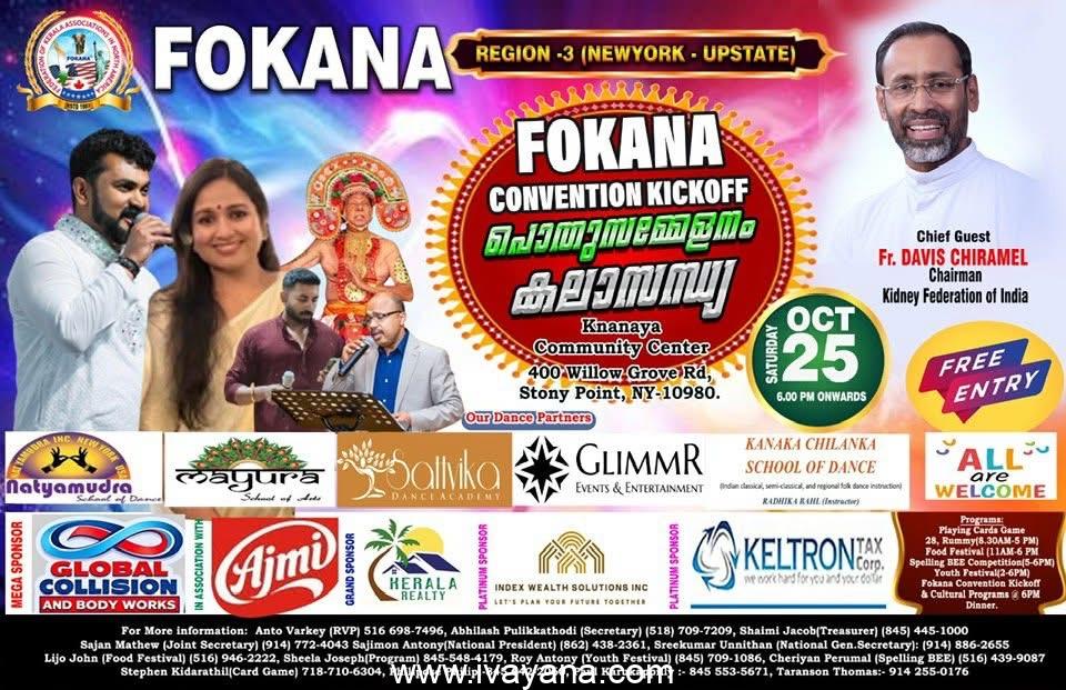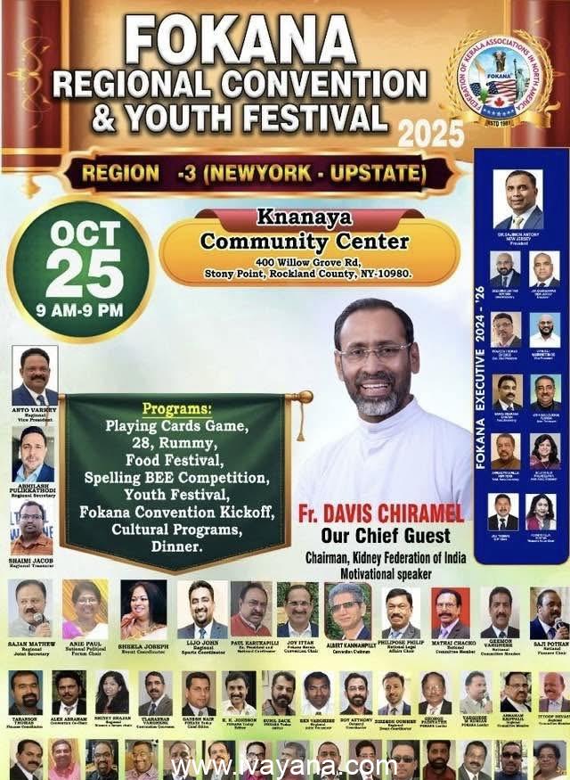 ന്യൂ യോർക്ക് : ഫൊക്കാന ന്യൂ യോർക്ക് അപ്പ്സ്റ്റേറ്റ് റീജിയണൽ കൺവെൻഷന്റെ ഒരുക്കങ്ങൾ പൂർത്തിയായി. ഫുഡ് ഫെസ്റ്റിവൽ, യൂത്ത് ഫെസ്റ്റിവൽ, സ്പെല്ലിങ് ബീ കോംപറ്റീഷൻ, ചിട്ടുകളി മത്സരം, ഫൊക്കാന കലഹരി ഇന്റർനാഷണൽ കൺവെൻഷൻ കിക്ക് ഓഫ് തുടങ്ങിയ നിരവധി പരിപാടികളോട് ആണ് റീജണൽ കൺവെൻഷൻ ചിട്ടപ്പെടുത്തിയിട്ടുള്ളത് . ഈ ശനിയാഴ്ച 2025 ഒക്ടോബർ 25, റോക്കലാൻഡ് കൗണ്ടിയിലെ ക്നാനായ കമ്മ്യൂണിറ്റി സെന്ററിൽ വെച്ച് (400 Willow Grove Road, Stony Point , Rockland County) നടത്തുന്ന റീജണൽ കൺവെൻഷനിലേക്കു ഏവരെയും സ്വാഗതം ചെയ്യുന്നു.