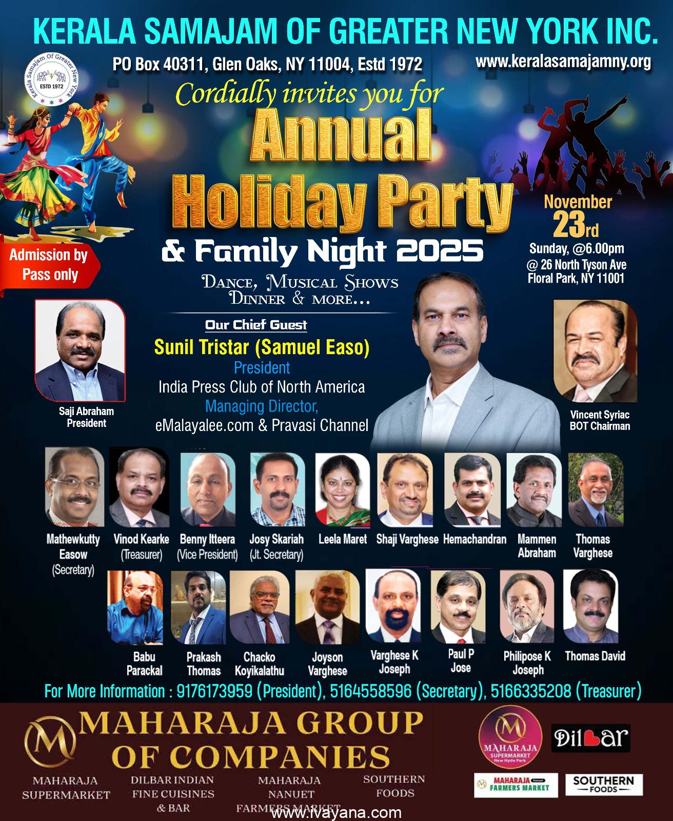 ന്യൂയോർക്ക്: അമേരിക്കയിലെ ഏറ്റവും ആദ്യത്തെ മലയാളീ സംഘടനയായ കേരളാ സമാജം ഓഫ് ഗ്രെയ്റ്റർ ന്യൂയോർക്ക് അതിന്റെ അൻപത്തിമൂന്നാമത് വർഷം വിജയകരമായി പൂർത്തീകരിക്കുന്നതിൻറെ ഭാഗമായി 2025-ലെ വാർഷിക ഡിന്നറും ഫാമിലി നെറ്റും നവംബർ 23 ഞായറാഴ്ച വിപുലമായി സംഘടിപ്പിക്കുവാനുള്ള ക്രമീകരണങ്ങൾ പുരോഗമിക്കുന്നു. 23-ന് ഞായറാഴ്ച വൈകിട്ട് 5:30 മുതൽ ഫ്ലോറൽ പാർക്കിലുള്ള ടൈസൺ സെന്റർ ഓഡിറ്റോറിയത്തിൽ വച്ച് (Tyson Center, 26 N Tyson Ave, Floral Park, NY 11004) വാർഷിക ആഘോഷം അതി വിപുലമായി നടത്തുന്നതിനാണ് പ്രസിഡൻറ് സജി എബ്രഹാമിന്റെ നേതൃത്വത്തിൽ എക്സിക്യൂട്ടിവ് കമ്മറ്റി ആസൂത്രണം ചെയ്യുന്നത്.