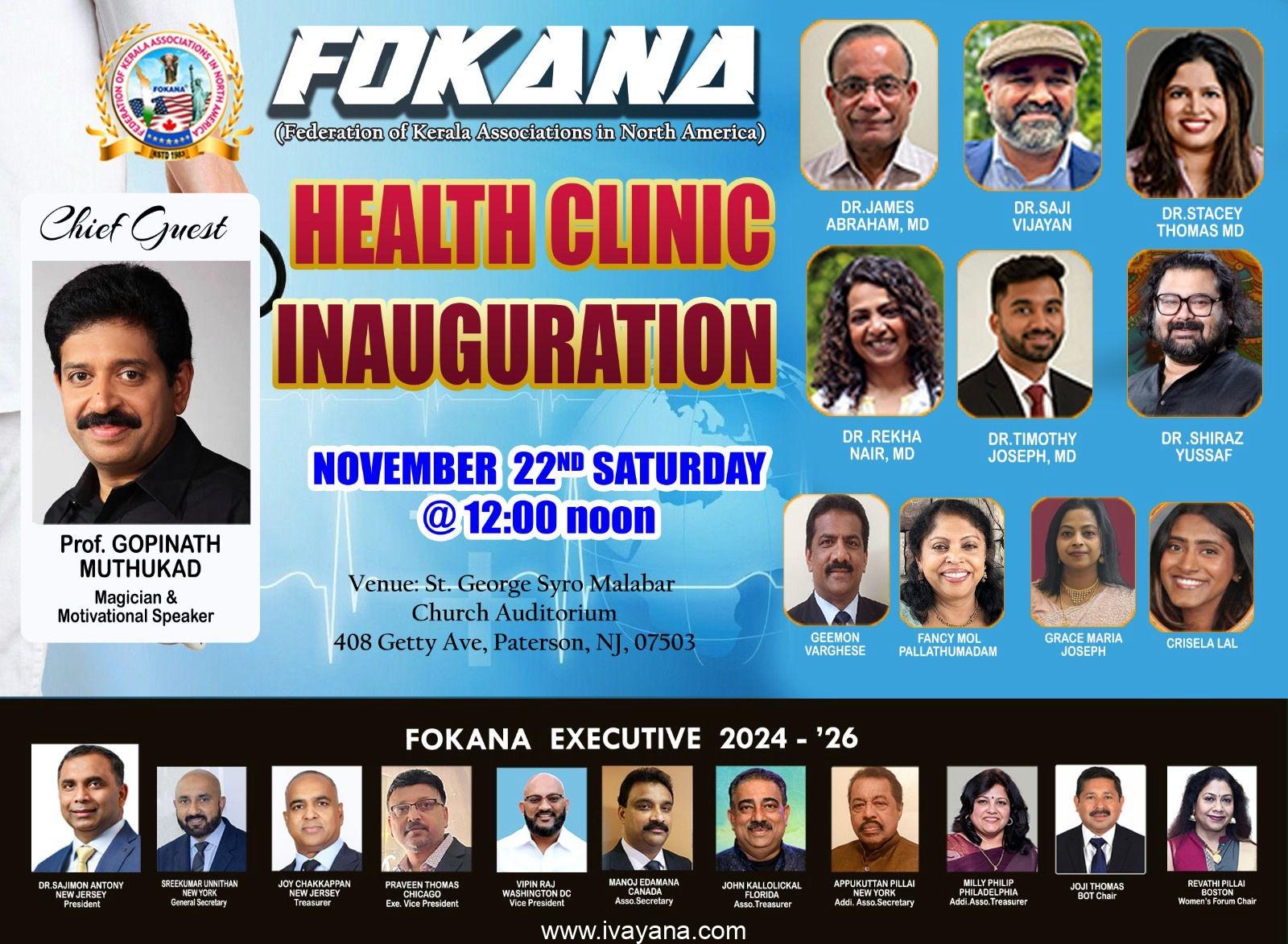 ന്യൂ യോർക്ക് : ഫൊക്കാനയുടെ ഡ്രീം പ്രൊജെക്ടുകളിൽ ഒന്നായ ഫൊക്കാന ഹെൽത്ത് ക്ലിനിക്കിന്റെ ഉൽഘാടനം പ്രമുഖ മജീഷ്യനും, സാമുഖ്യ പ്രവർത്തകനുമായ പ്രൊഫ . ഗോപിനാഥ് മുതുകാട് നവംബർ 22 ,ശനിയാഴ്ച ഉച്ചക്ക് 12 മണി മുതൽ സെന്റ്. ജോർജ് സിറോ മലബാർ ചർച്ച് ഓഡിറ്റോറിയത്തിൽ ( 408 Getty Avenue, Paterson, NJ 07503)വെച്ച് നിർവഹിക്കുമെന്ന് പ്രസിഡന്റ് സജിമോൻ ആന്റണി അറിയിച്ചു.