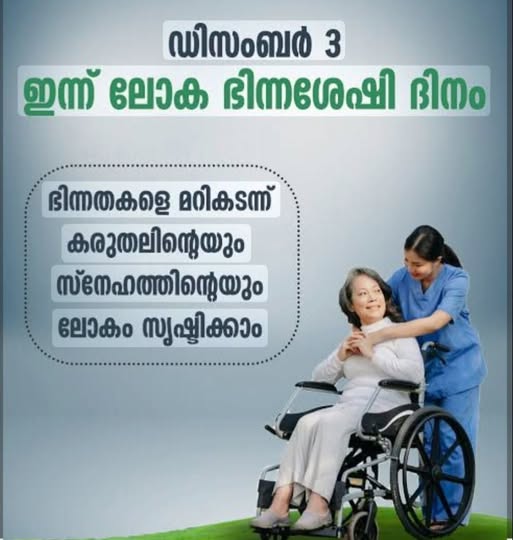 എല്ലാ വർഷവും ഡിസംബർ 3 ലോകമെമ്പാടും ഭിന്നശേഷിയുള്ളവരുടെ അവകാശങ്ങളെയും ക്ഷേമത്തെയും കുറിച്ച് അവബോധം വളർത്താനായി ലോക ഭിന്നശേഷി ദിനമായി ആചരിക്കുന്നു. ശാരീരികമോ മാനസികമോ ആയ വെല്ലുവിളികൾ നേരിടുന്ന മനുഷ്യരെ സമൂഹത്തിൻ്റെ മുഖ്യധാരയിലേക്ക് കൊണ്ടുവരാനും, അവർക്ക് തുല്യത ഉറപ്പാക്കാനുമാണ് ഈ ദിനം ലക്ഷ്യമിടുന്നത്.