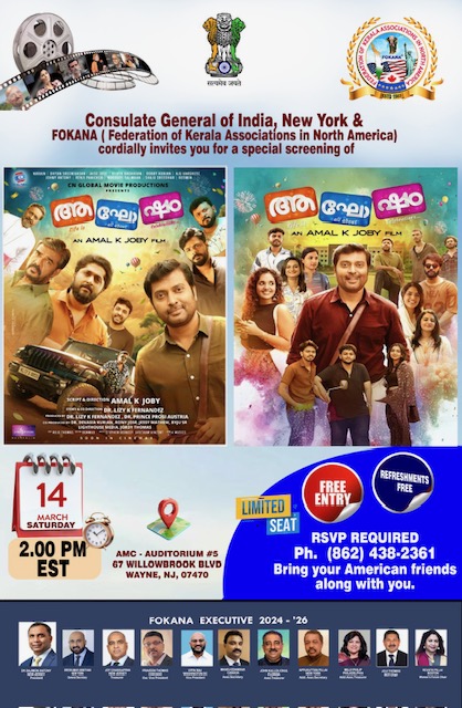 പ്രദർശനത്തിലേക്കുള്ള പ്രവേശനം തികച്ചും സൗജന്യമാണ് എന്നാൽ സീറ്റുകൾ പരിമിതമായതിനാൽ താല്പര്യമുളവർ ന്യൂ ജേഴ്സി റീജണൽ വൈസ് പ്രസിഡന്റ് കോശി കുരുവിളയുമായി 201-450-1757 ബന്ധപെട്ടു മുൻകൂട്ടി പേര് രജിസ്റ്റർ ചെയ്യേണ്ടുന്നതാണ് .”Life is all about celebration” എന്ന ടാഗ്ലൈനോട് കൂടി എത്തുന്ന ഈ ചിത്രം അമേരിക്കൻ മലയാളീ സമൂഹത്തിന് ഒരു നവ്യസിനിമാ അനുഭവം ആയിരിക്കും സമ്മാനിക്കുക.