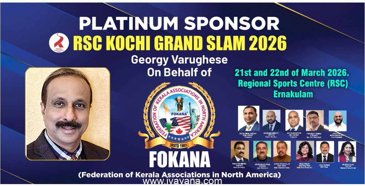 ഫ്ലോറിഡ : വെറ്ററൻ സർക്യൂട് വിഭാഗത്തിലെ സംസ്ഥാനത്തെ ഏറ്റവും വലിയ ടൂർണമെന്റായ RSC കൊച്ചി ഗ്രാൻഡ് സ്ലാം 2026, മാർച്ച് 21-22 തീയതികളിൽ എറണാകുളം റീജിയണൽ സ്പോർട്സ് സെന്റർ (RSC)-ലെ ജസ്റ്റിസ് പി ഗോവിന്ദൻ നായർ ഇൻഡോർ ടെന്നീസ് കോംപ്ലക്സ്കിൽ അരങ്ങേറുബോൾ ഫൊക്കാനയും ഇതിൽ ഭാഗവത്താകുന്നു.