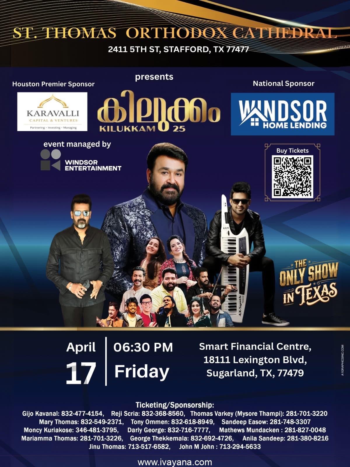 ഹൂസ്റ്റൺ സെന്റ് തോമസ് ഇന്ത്യൻ ഓർത്തഡോക്സ് കത്തീഡ്രൽ സംഘടിപ്പിക്കുന്ന“കിലുക്കം 25” , വിൻസർ ഹോം ലെൻഡിംഗിന്റെ സഹകരണത്തോടെയാണ് നടക്കുന്നത്. വിൻസർ എന്റർടെയിൻമെന്റാണ് പരിപാടിയുടെ മാനേജ്മെന്റ്.