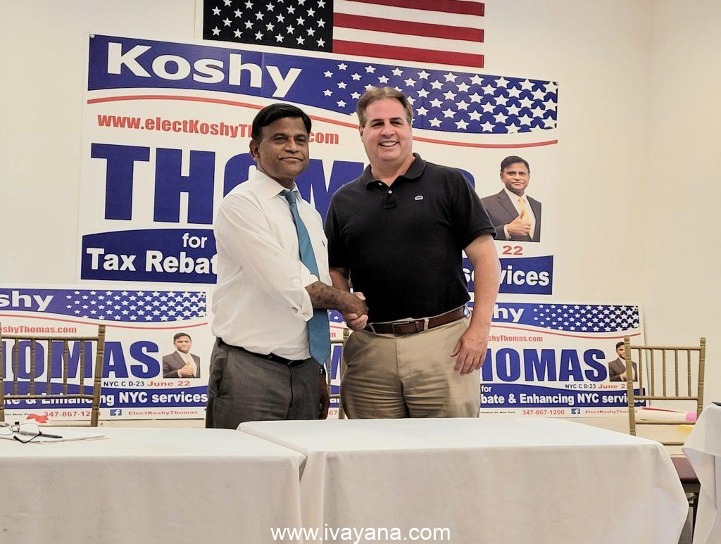 കോശി തോമസിനു വിജയാശംസകൾ നേർന്നതോടൊപ്പം ഈ പ്രൈമറി തെരഞ്ഞെടുപ്പിൽ കോശി വിജയിച്ചാൽ നവംബറിൽ നടക്കുന്ന ഫൈനൽ തെരഞ്ഞെടുപ്പിൽ എല്ലാവിധ പിന്തുണയും നൽകാമെന്ന് സ്റ്റീവ് പ്രസ്താവിച്ചു. അതുപോലെ താനാണ് പ്രൈമറിയിൽ വിജയിക്കുന്നതെങ്കിൽ ഫൈനൽ തെരഞ്ഞെടുപ്പിൽ പൂർണ പിന്തുണ കോശി തനിക്കു നൽകണമെന്നും സ്റ്റീവ് അഭ്യർഥിച്ചു. ഈ വര്ഷം റാങ്ക്ഡ് ചോയ്സ് സംവിധാനത്തിൽ വോട്ടിംഗ് നടക്കുന്നതിനാൽ തന്നെ പിന്തുണക്കുന്ന വോട്ടർമാരോട് കോശിക്കും പിന്തുണ നൽകണമെന്ന് സോഷ്യൽ മീഡിയാ വഴി അഭ്യർത്ഥിക്കാമെന്നു സ്റ്റീവ് കോശിക്ക് ഉറപ്പു നൽകി. അതുപോലെ കോശിയെ പിന്തുണക്കുന്ന വോട്ടർമാരോട് റാങ്ക്ഡ് ചോയ്സ് വോട്ടിങ്ങിൽ സ്റ്റീവിനെയും പിന്തുണക്കണമെന്ന് അഭ്യർത്ഥിക്കാമെന്നു കോശിയും ഉറപ്പു നൽകി. ഈ വർഷം ന്യൂയോർക്ക് സിറ്റിയിൽ പുതുതായി ഏർപ്പെടുത്തിയ സംവിധാനമാണ് റാങ്ക്ഡ് ചോയ്സ് വോട്ടിംഗ്. ഇത് മൂലം പ്രൈമറി ഇലക്ഷനിൽ വോട്ട് രേഖപ്പെടുത്തുന്ന വോട്ടർമാർക്ക് അവരവരുടെ താല്പര്യമനുസരിച്ചു അഞ്ചു സ്ഥാനാർത്ഥികൾക്കു ഒന്ന് മുതൽ അഞ്ചു വരെ റാങ്ക് നൽകി വോട്ട് രേഖപ്പെടുത്താവുന്നതാണ്. അതിനാൽ ഒരു സ്ഥാനത്തേക്ക് ഒന്നിലധികം പേർക്ക് റാങ്ക് അനുസരിച്ചു വോട്ട് രേഖപ്പെടുത്തിയാലും അസാധു ആവുകയില്ല. അഞ്ചു റാങ്കിൽ കൂടുതൽ വോട്ട് നൽകിയാൽ അത് അസാധുവാകും. രണ്ടു പേരും പരസ്പരം വാഗ്ദാനങ്ങൾ കൈമാറി ഹസ്തദാനം നൽകുകയും ചെയ്തു.