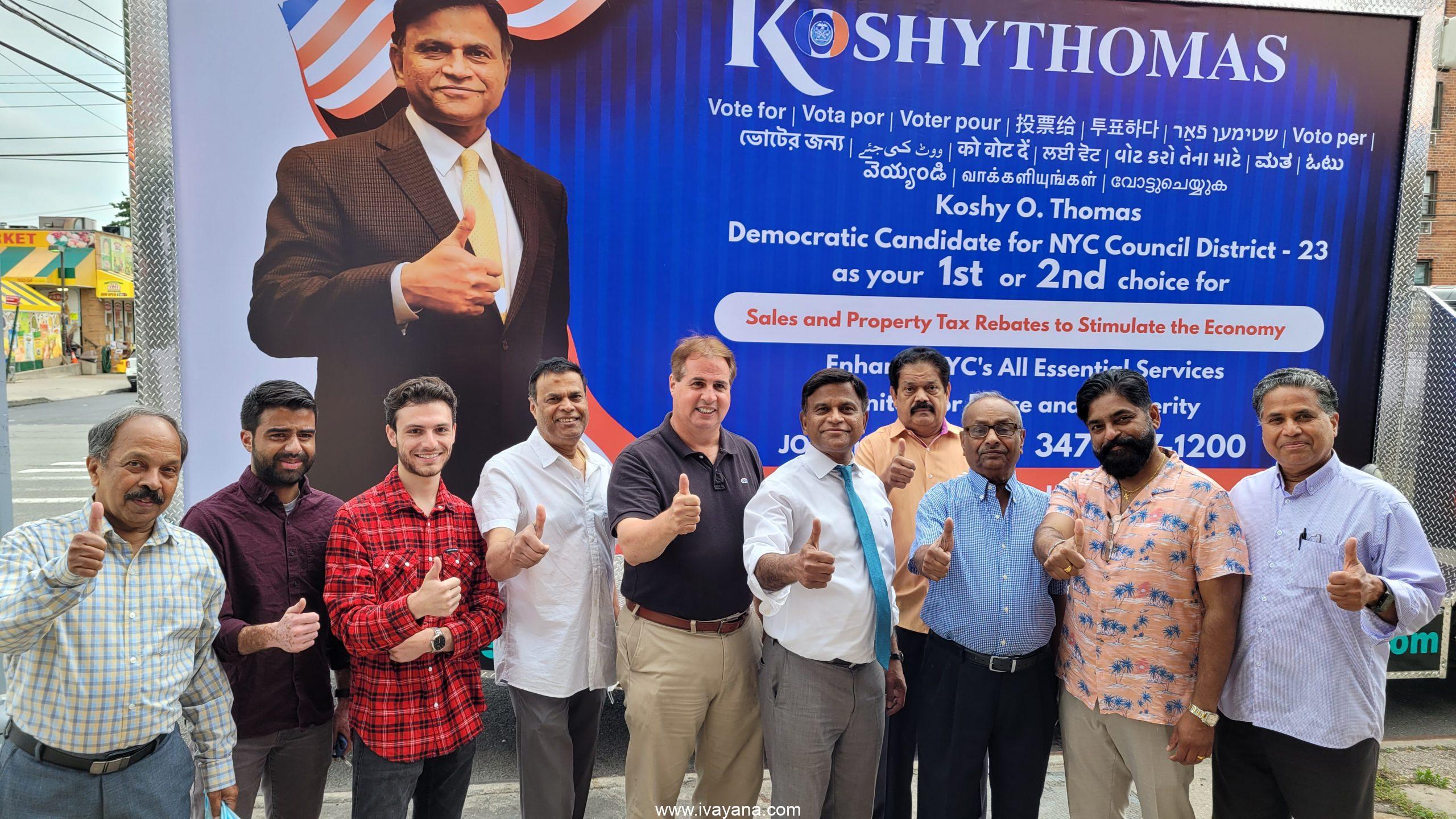 നാല് ഇന്ത്യൻ സ്ഥാനാർഥികളിൽ മൂന്ന് പേർ പഞ്ചാബികളാണ്. മലയാളി വോട്ടർമാരുടെ സാന്നിധ്യം കൂടുതലായുള്ള ന്യൂയോർക്കിലെ ക്യൂൻസ് വില്ലേജ്, ബേസൈഡ് ഹിൽസ്, ബെല്ലറോസ്, ഡഗ്ലസ്റ്റൺ, ഫ്ളോറൽ പാർക്ക്, ന്യൂ ഹൈഡ് പാർക്ക് (ചില ഭാഗങ്ങൾ), ഫ്രഷ് മെഡോസ്, ഗ്ലെൻ ഓക്സ്, ഹോളിസ്, ഹോളിസ് ഹിൽസ്, ഹോളിസ്വുഡ്, ലിറ്റിൽ നെക്ക്, ഓക്ലാൻഡ് ഗാർഡൻസ് എന്നിവിടങ്ങളിലെ ഡെമോക്രാറ്റിക് പാർട്ടിയിൽ രെജിസ്റ്റർ ചെയ്തു അംഗത്വമുള്ള എല്ലാ ഇന്ത്യാക്കാരും പ്രത്യേകിച്ച് മലയാളികളും ജൂൺ 12 മുതൽ 22 വരെയുള്ള ദിവസങ്ങളിൽ കോശിക്ക് വേണ്ടി വോട്ട് രേഖപ്പെടുത്തിയാൽ കോശിക്ക് നിഷ്പ്രയാസം വിജയിക്കുവാൻ സാധിക്കുന്നതാണ്.